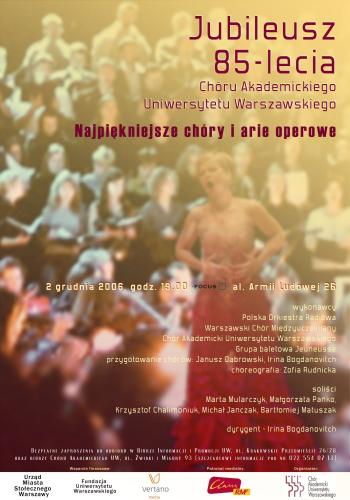 Na jubileuszowym koncercie w dniu 2 grudnia ub. roku pod znamienitą dyrekcją Pani Iriny Bogdanovitch Chór zaprezentował bogaty program złożony z fragmentów najpiękniejszych oper, między innymi G. Verdiego, P. Czajkowskiego, G. Bizeta, S. Moniuszki. Współwykonawcami byli: Warszawski Chór Międzyuczelniany, Polska Orkiestra Radiowa, soliści i grupa baletowa. Przyjęliśmy jubileuszowy występ z entuzjazmem. Bogaty, atrakcyjny program i znakomite wykonawstwo - prawdziwa uczta duchowa.
