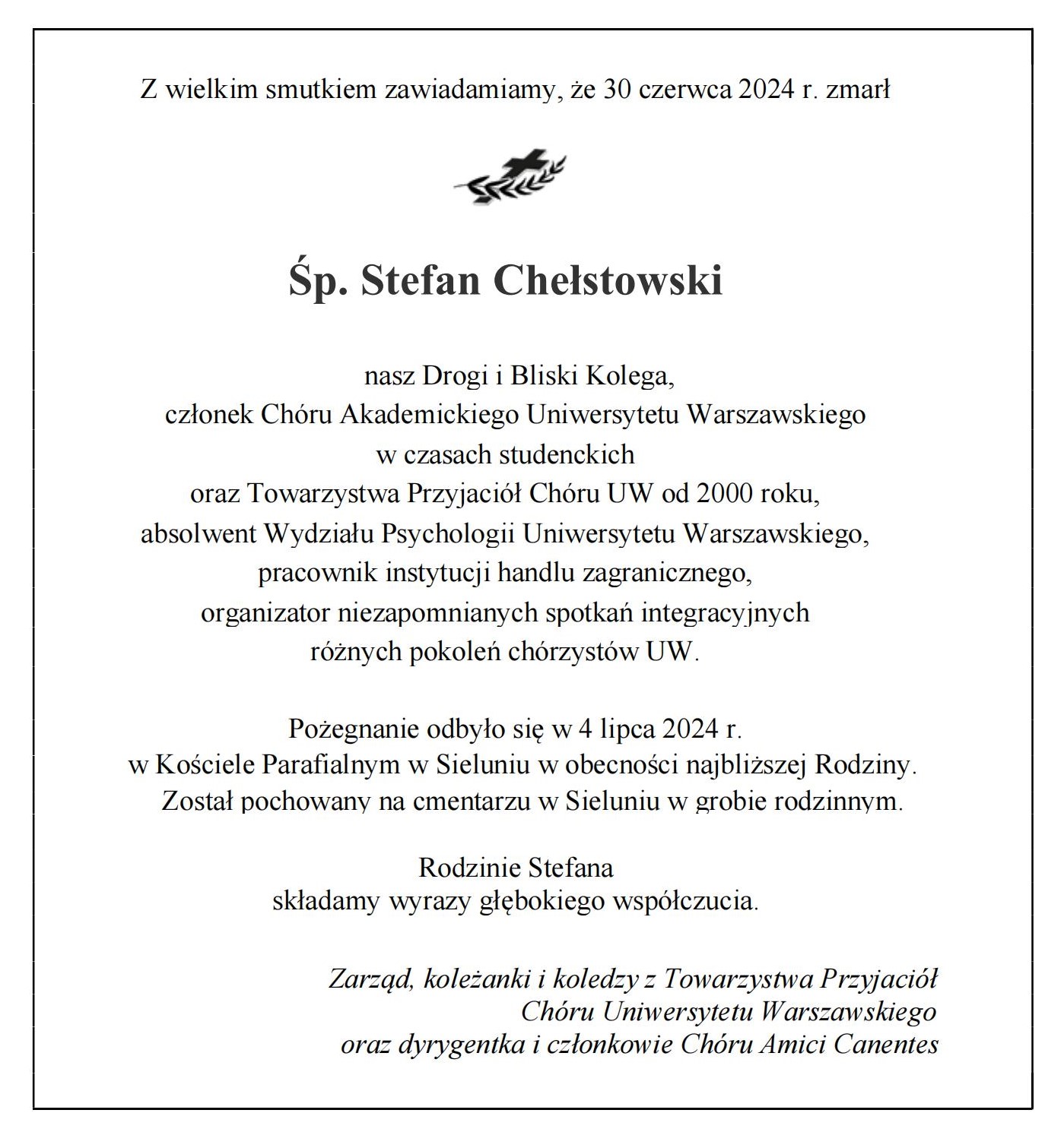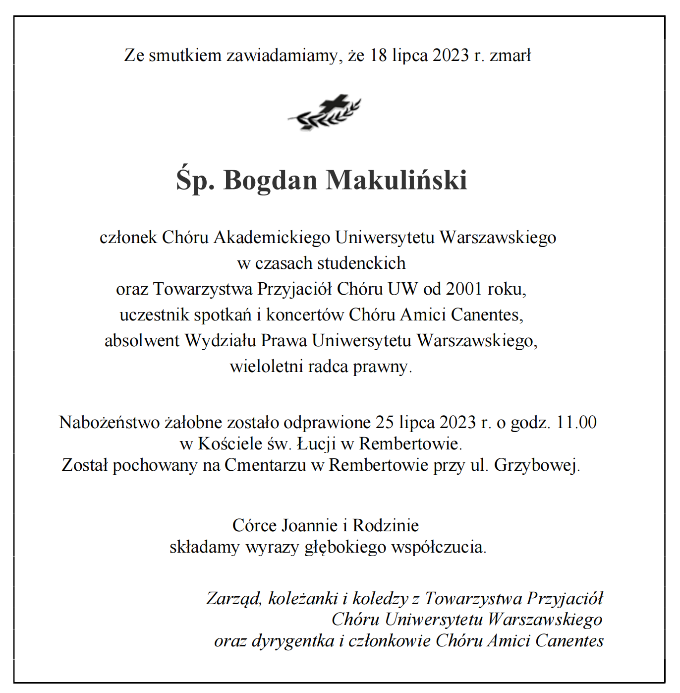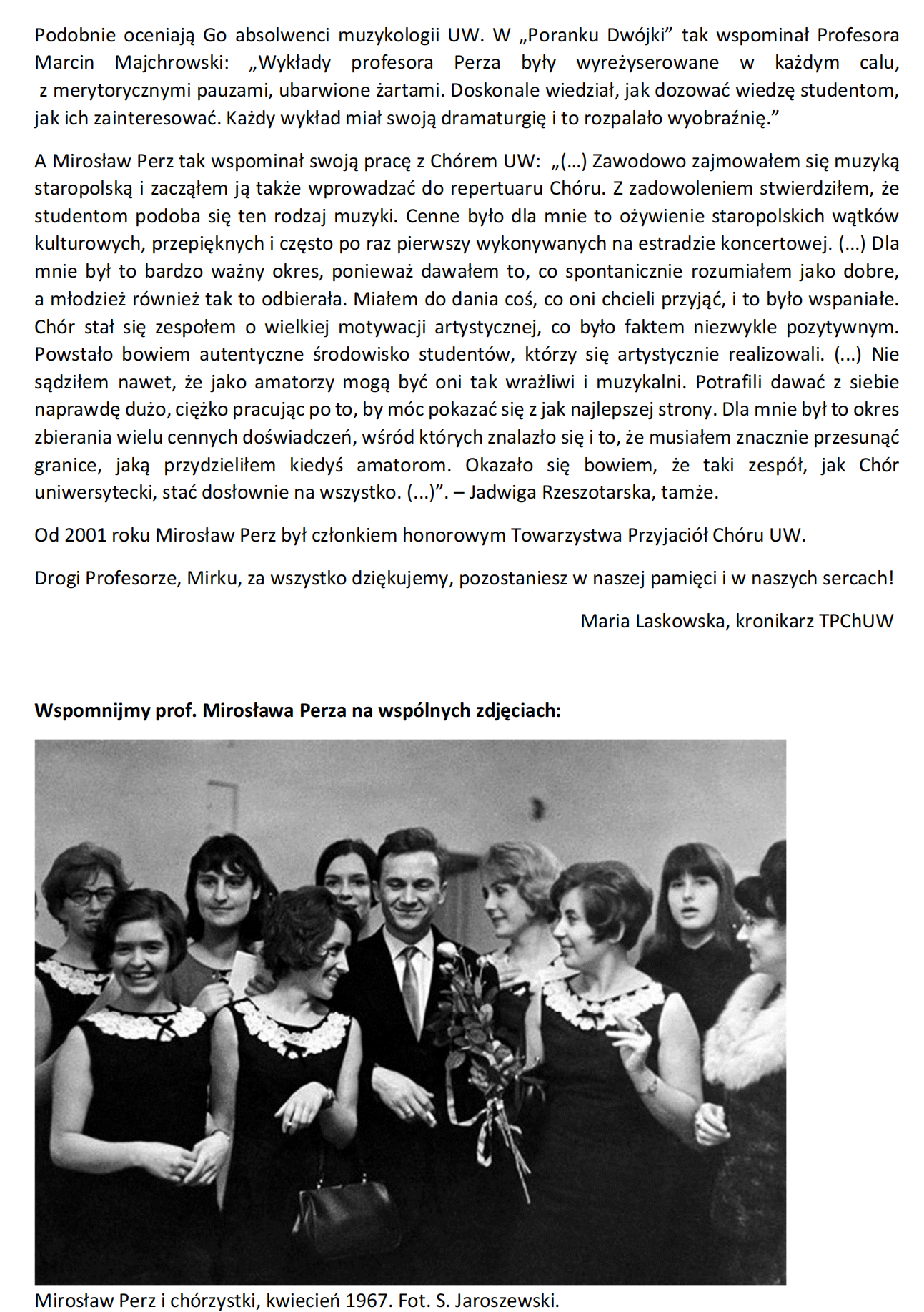Z chórem nie zerwała kontaktów do końca życia. To był jej żywioł, i, jak mówiła, najsilniejsze kontakty osobiste utrzymywała przez długie lata właśnie z byłymi chórzystami. Ta pasja i to zaangażowanie sprawiło, że w roku 2000 stała się jedną z założycielek, a potem wieloletnią prezeską Towarzystwa Przyjaciół Chóru Uniwersytetu Warszawskiego. Z uwagi na zasługi jakie wniosła swoją działalnością, gdy już sił brakowało do intensywnej pracy, otrzymała tytuł członka honorowego, który nadal jej przysługuje.