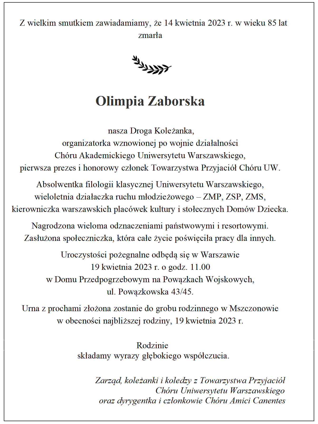 Oczywiście, emerytura nie oznaczała dla Olimpii koniec pracy. Wspomniałam już o ogromnej zasłudze jaką położyła, na przełomie lat 90-tych, w zorganizowanie Towarzystwa Przyjaciół Chóru Uniwersytetu Warszawskiego i jej osobisty wkład w obchody 80-lecia istnienia Chóru UW.