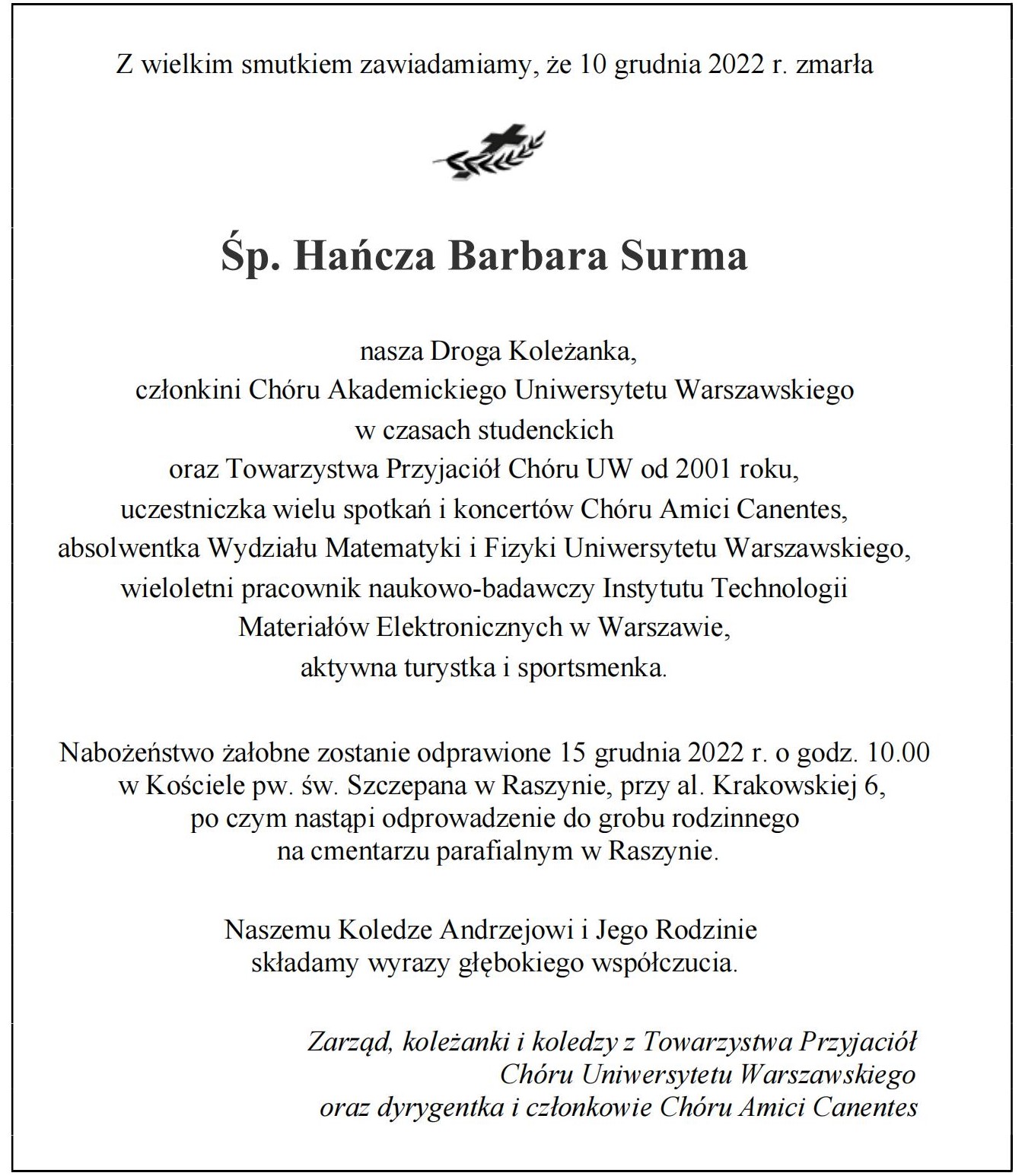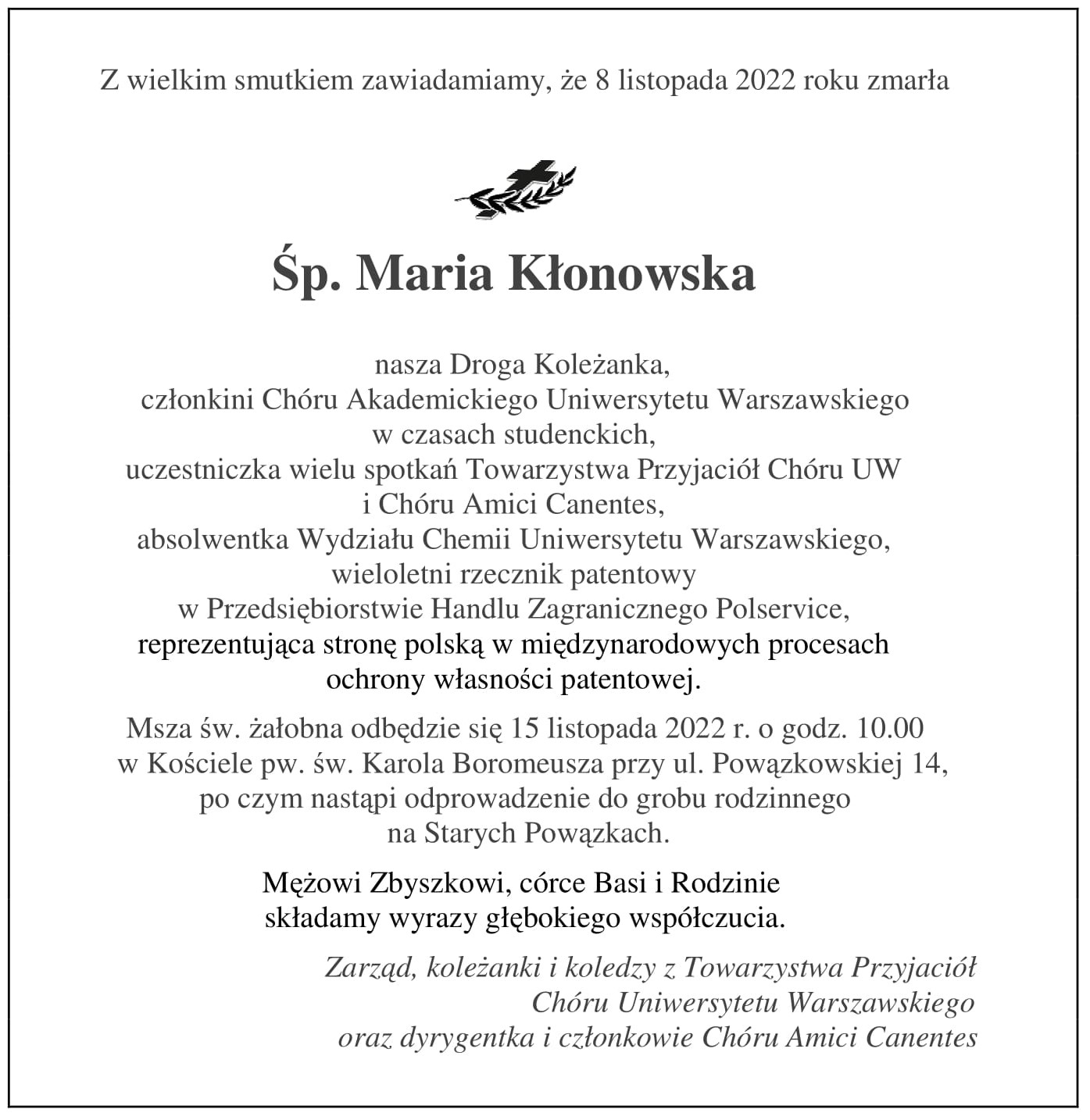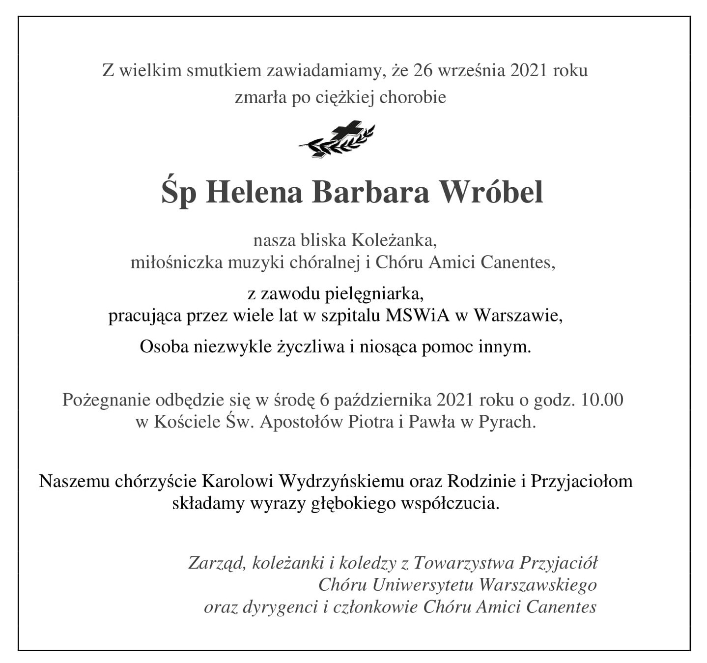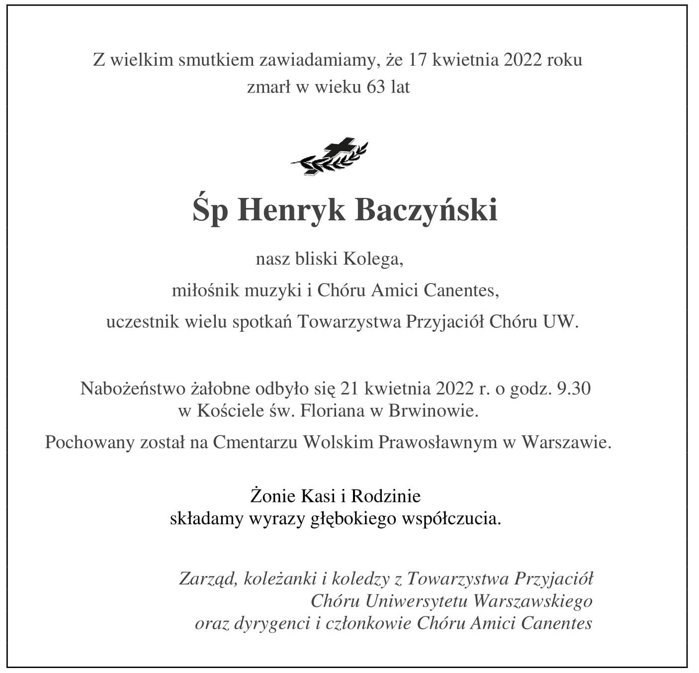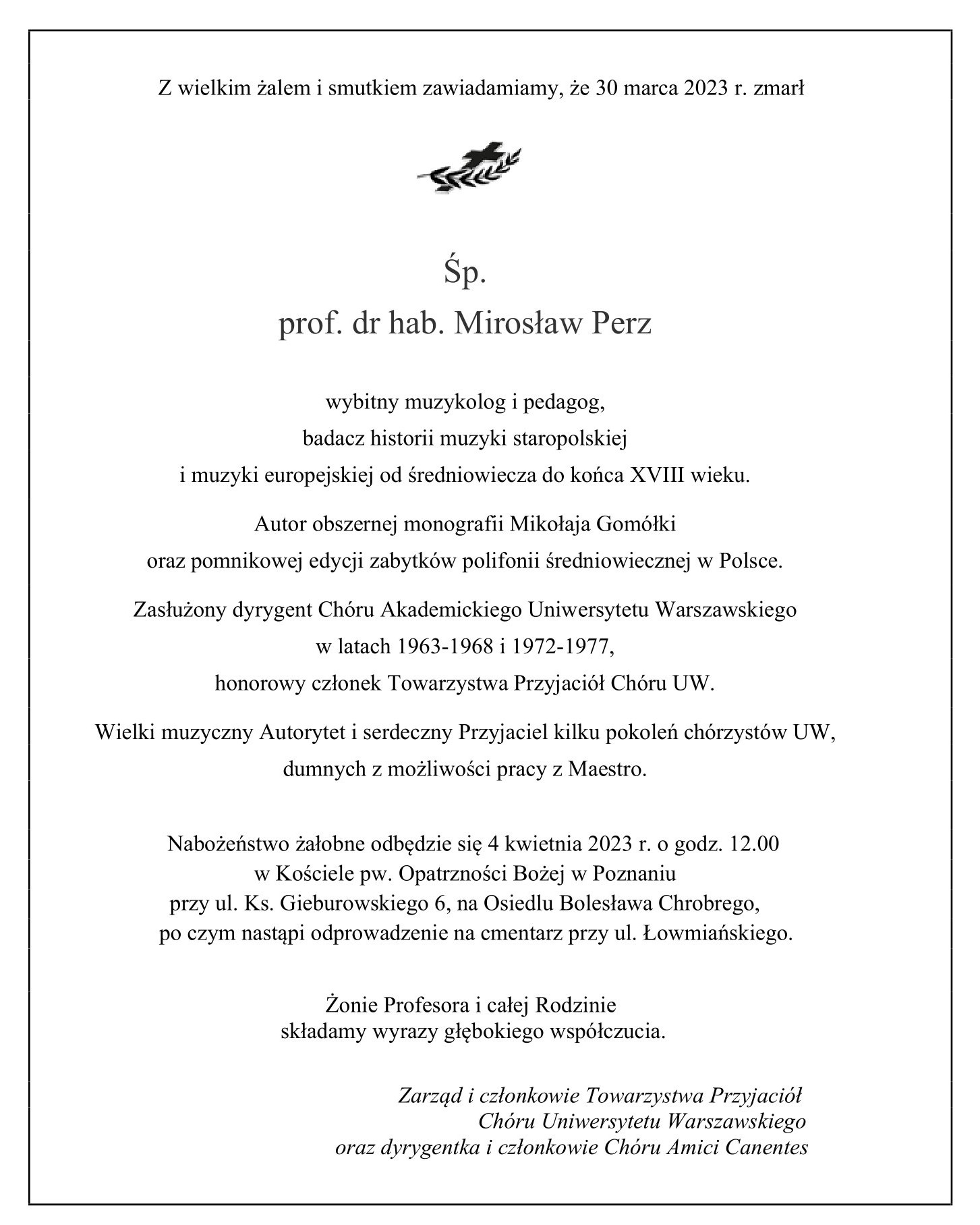 Podczas uroczystości pogrzebowej w Poznaniu pożegnali Śp. Prof. Mirosława Perza m.in. przedstawiciele Instytutu Muzykologii UW i Towarzystwa Przyjaciół Chóru UW.